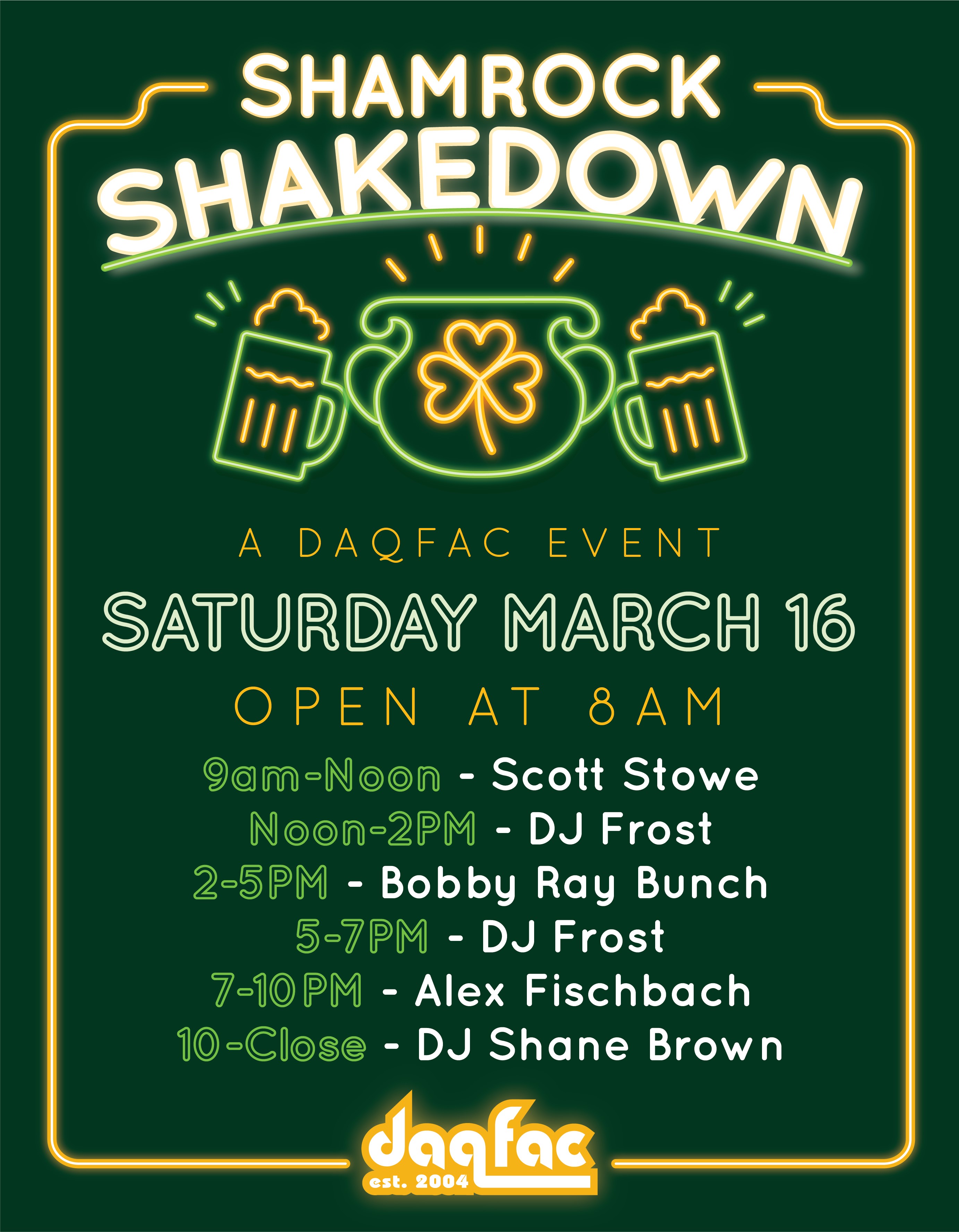 Listen to live music and dance with an Irish Quaalude in your hand starting at 9 AM at DaqFaq!