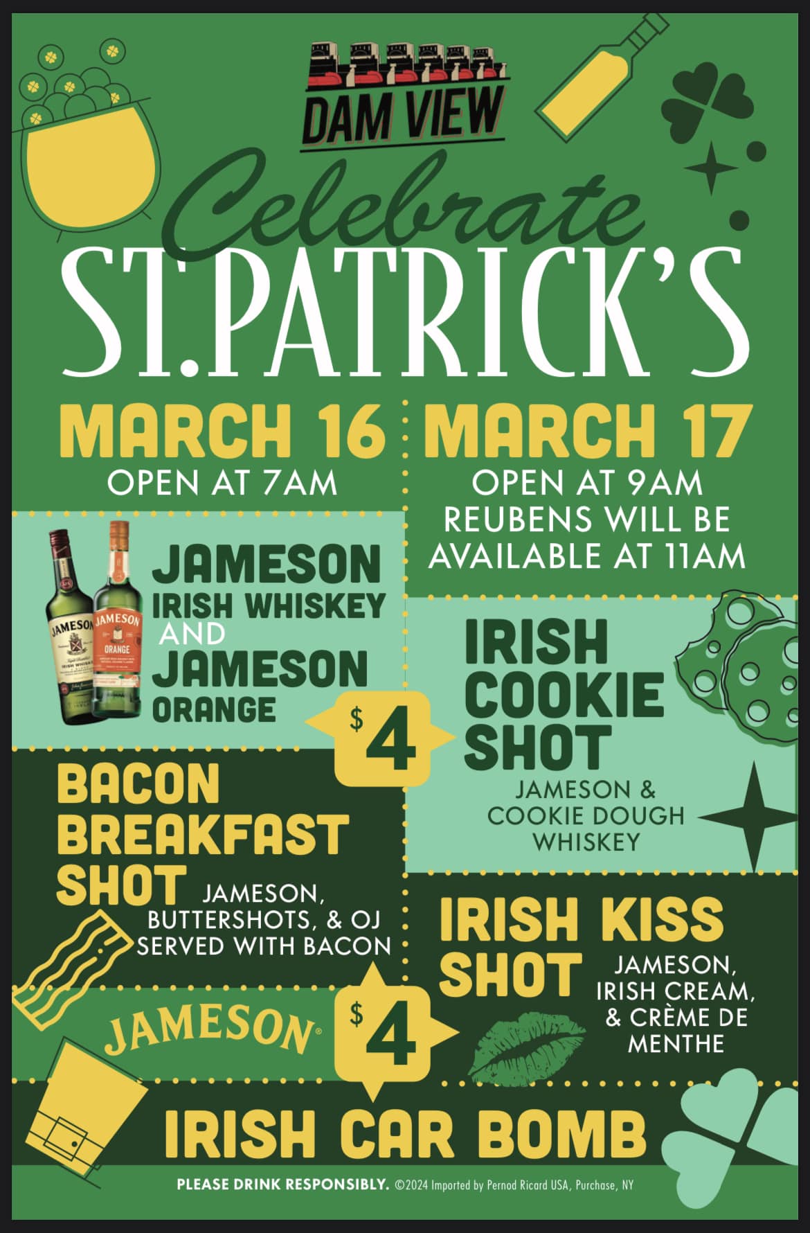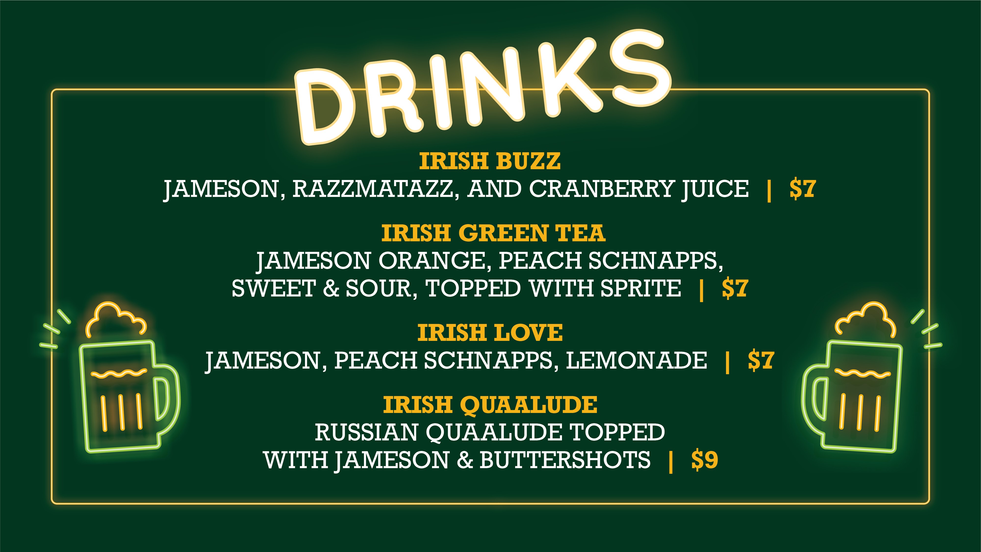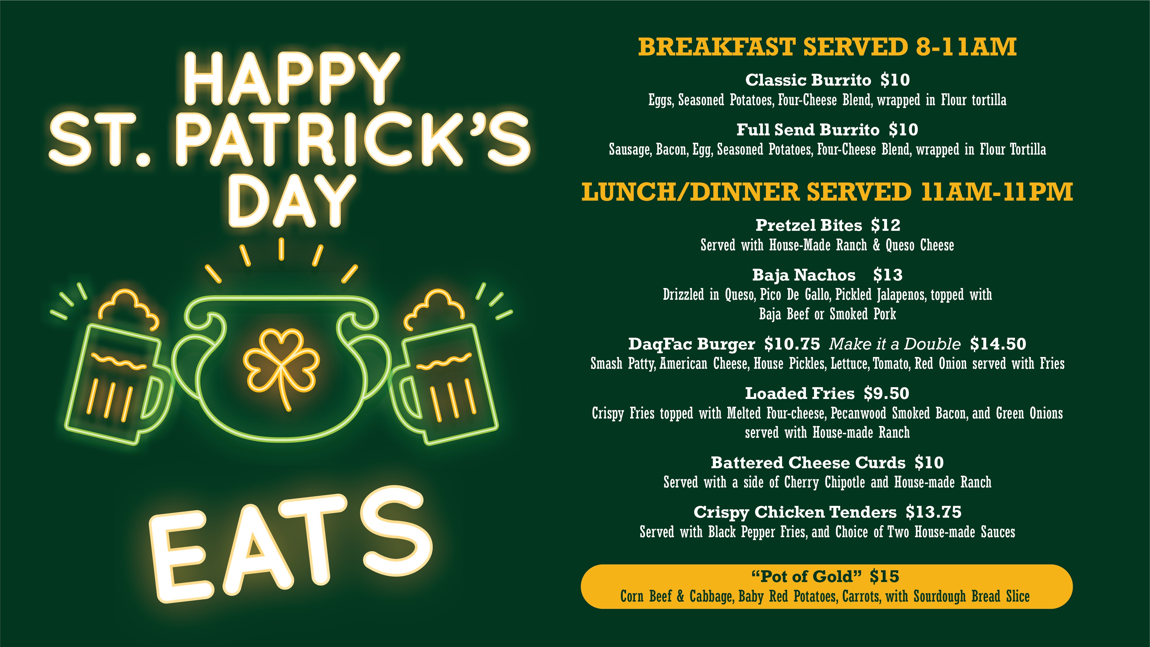 Food & Drink specials all day on Saturday, March 16th: